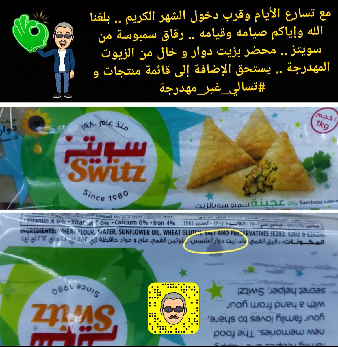 جديد من سويتز، عجينة سمبوسة مع زيت دوار الشمس. عجينة سمبوسة سويتز بنت البلد 1 كيلو 14.01 ريال. شكرا hayatlife_k@ على مشاركة هذه الوصفة الرائعة. أفضل انواع دقيق القمح مخلوط مع زيت دوار الشمس. ٠٨:٥٤ ، ١٣ أبريل ٢٠٢٠.